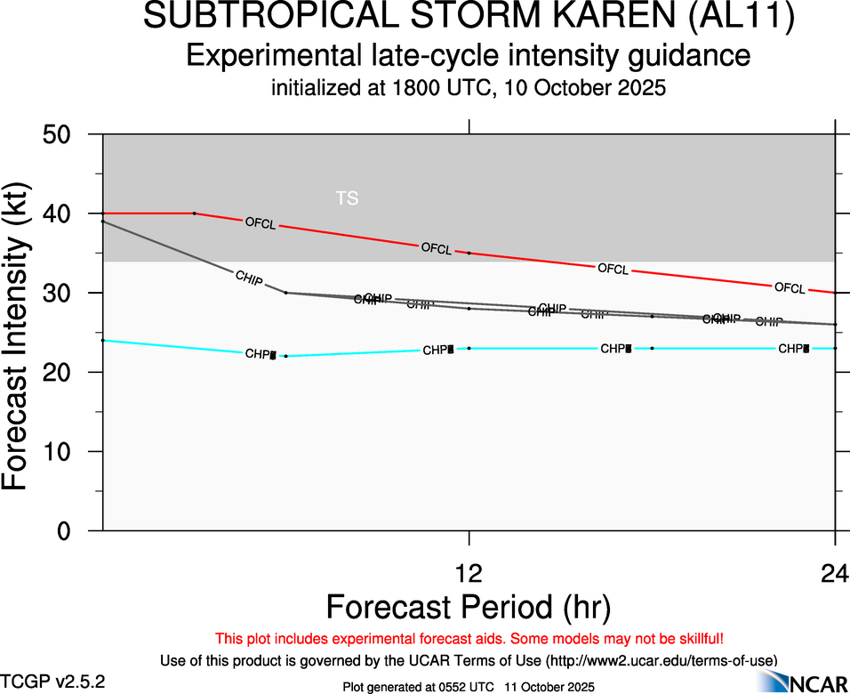 This page provides plots and information for SUBTROPICAL STORM KAREN (AL11). The left side of this page provides TCGP-generated plots of numerical guidance and other TCGP-curated data. The right side of this page provides external links to additional information and products. Most of the model guidance displayed in the plots come from modeling centers outside of NCAR, such as NOAA, other national numerical weather prediction centers, and universities. Click here for information about who contributes to TCGP. Your use of this page is governed by the UCAR Terms of Service and this site's disclaimer. To obtain help for any item on this page, click on the question mark beside that item.