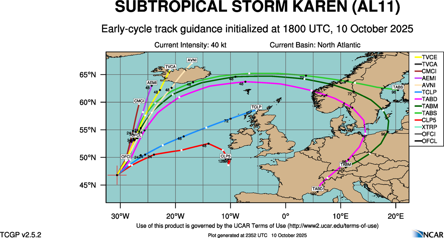 At 1800 UTC, 10 October 2025, SUBTROPICAL STORM KAREN (AL11) was located in the North Atlantic basin at 46.8°N and 30.6°W. The current intensity was 40 kt and the center was moving at 12 kt at a bearing of 35 degrees. The minimum central pressure was 1000 mb.