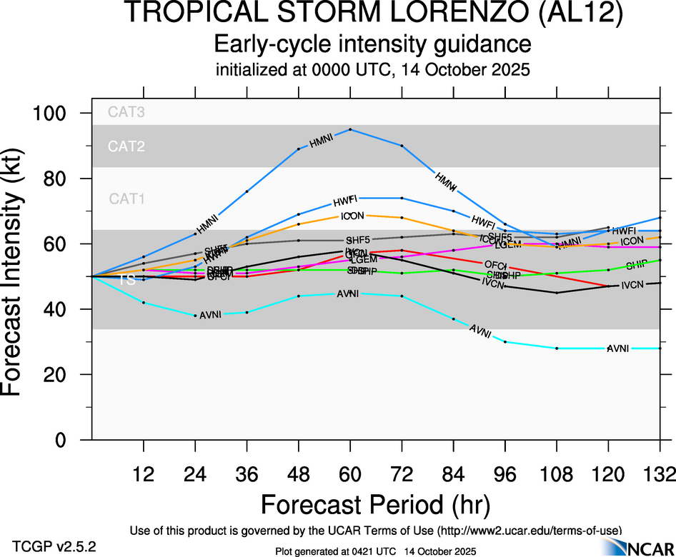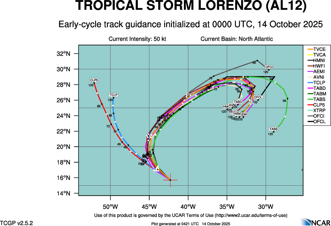 At 0000 UTC, 14 October 2025, TROPICAL STORM LORENZO (AL12) was located in the North Atlantic basin at 15.7°N and 42.3°W. The current intensity was 50 kt and the center was moving at 11 kt at a bearing of 305 degrees. The minimum central pressure was 999 mb.