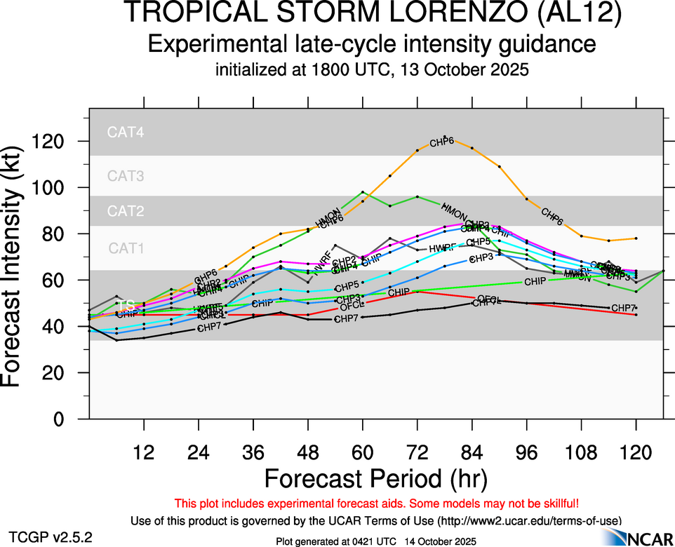 This page provides plots and information for TROPICAL STORM LORENZO (AL12). The left side of this page provides TCGP-generated plots of numerical guidance and other TCGP-curated data. The right side of this page provides external links to additional information and products. Most of the model guidance displayed in the plots come from modeling centers outside of NCAR, such as NOAA, other national numerical weather prediction centers, and universities. Click here for information about who contributes to TCGP. Your use of this page is governed by the UCAR Terms of Service and this site's disclaimer. To obtain help for any item on this page, click on the question mark beside that item.