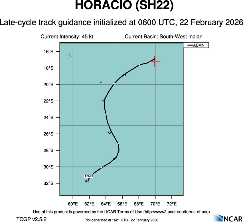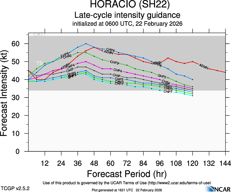 This page provides plots and information for HORACIO (SH22). The left side of this page provides TCGP-generated plots of numerical guidance and other TCGP-curated data. The right side of this page provides external links to additional information and products. Most of the model guidance displayed in the plots come from modeling centers outside of NCAR, such as NOAA, other national numerical weather prediction centers, and universities. Click here for information about who contributes to TCGP. Your use of this page is governed by the UCAR Terms of Service and this site's disclaimer. To obtain help for any item on this page, click on the question mark beside that item.