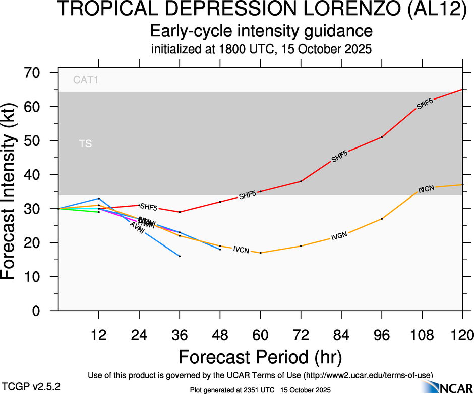 This page provides plots and information for TWELVE (AL12). The left side of this page provides TCGP-generated plots of numerical guidance and other TCGP-curated data. The right side of this page provides external links to additional information and products. Most of the model guidance displayed in the plots come from modeling centers outside of NCAR, such as NOAA, other national numerical weather prediction centers, and universities. Click here for information about who contributes to TCGP. Your use of this page is governed by the UCAR Terms of Service and this site's disclaimer. To obtain help for any item on this page, click on the question mark beside that item.