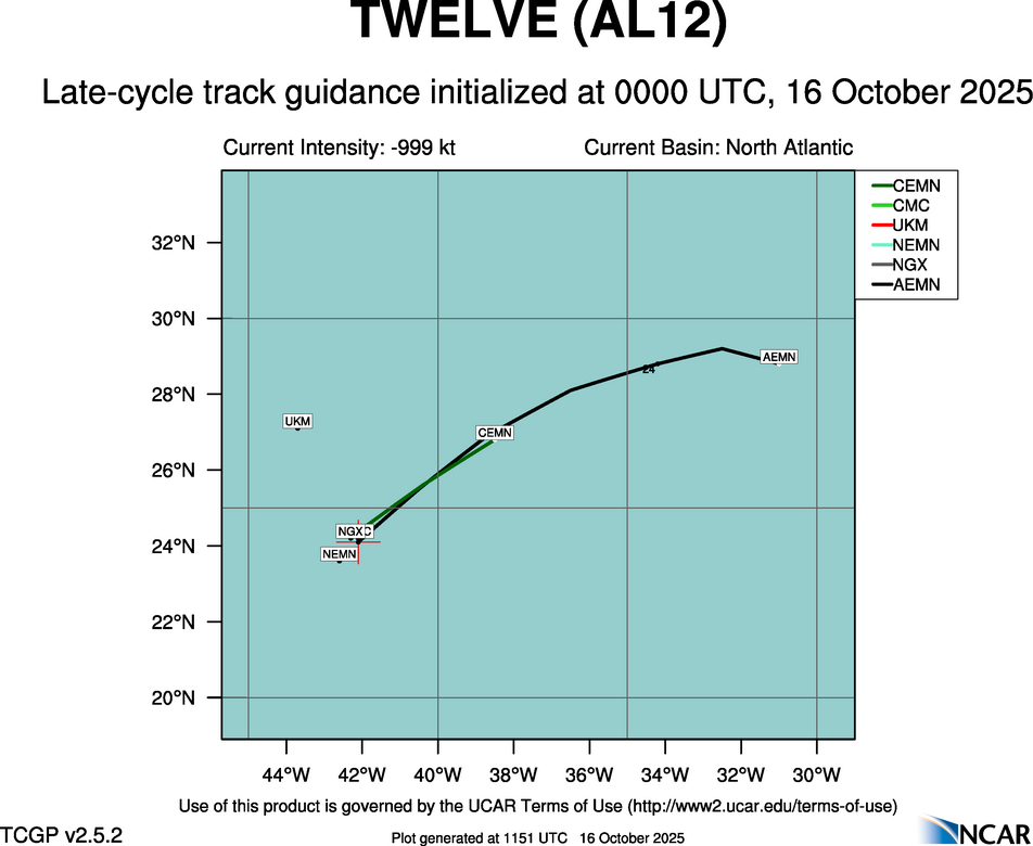 At 0000 UTC, 16 October 2025, TWELVE (AL12) was located in the North Atlantic basin at 24.5°N and 42.4°W. The current intensity was -999 kt and the center was moving at -999 kt at a bearing of -999 degrees. The minimum central pressure was -999 mb.