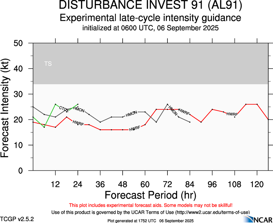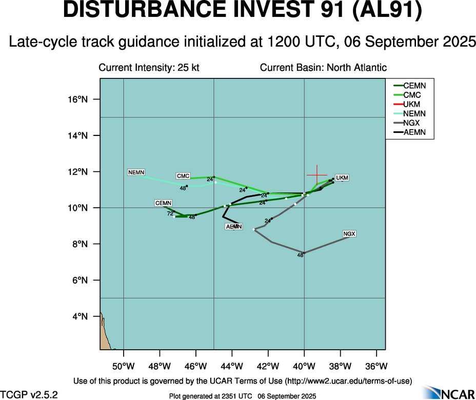 This page provides plots and information for INVEST 91 (AL91). The left side of this page provides TCGP-generated plots of numerical guidance and other TCGP-curated data. The right side of this page provides external links to additional information and products. Most of the model guidance displayed in the plots come from modeling centers outside of NCAR, such as NOAA, other national numerical weather prediction centers, and universities. Click here for information about who contributes to TCGP. Your use of this page is governed by the UCAR Terms of Service and this site's disclaimer. To obtain help for any item on this page, click on the question mark beside that item.