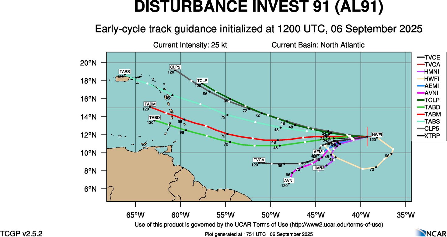At 1800 UTC, 06 September 2025, INVEST 91 (AL91) was located in the North Atlantic basin at 11.1°N and 40°W. The current intensity was -999 kt and the center was moving at -999 kt at a bearing of -999 degrees. The minimum central pressure was -999 mb.
