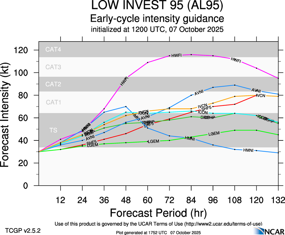 This page provides plots and information for LOW INVEST 95 (AL95). The left side of this page provides TCGP-generated plots of numerical guidance and other TCGP-curated data. The right side of this page provides external links to additional information and products. Most of the model guidance displayed in the plots come from modeling centers outside of NCAR, such as NOAA, other national numerical weather prediction centers, and universities. Click here for information about who contributes to TCGP. Your use of this page is governed by the UCAR Terms of Service and this site's disclaimer. To obtain help for any item on this page, click on the question mark beside that item.