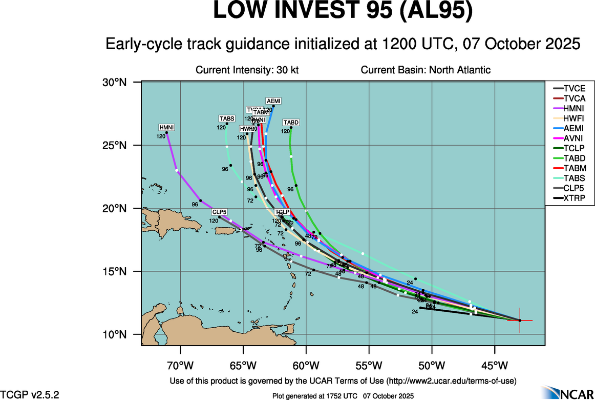 At 1200 UTC, 07 October 2025, LOW INVEST 95 (AL95) was located in the North Atlantic basin at 11.1°N and 43°W. The current intensity was 30 kt and the center was moving at 19 kt at a bearing of 280 degrees. The minimum central pressure was 1008 mb.