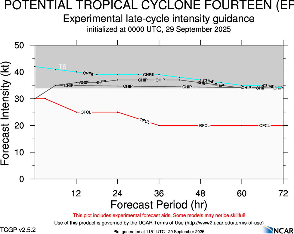 This page provides plots and information for FOURTEEN (EP14). The left side of this page provides TCGP-generated plots of numerical guidance and other TCGP-curated data. The right side of this page provides external links to additional information and products. Most of the model guidance displayed in the plots come from modeling centers outside of NCAR, such as NOAA, other national numerical weather prediction centers, and universities. Click here for information about who contributes to TCGP. Your use of this page is governed by the UCAR Terms of Service and this site's disclaimer. To obtain help for any item on this page, click on the question mark beside that item.