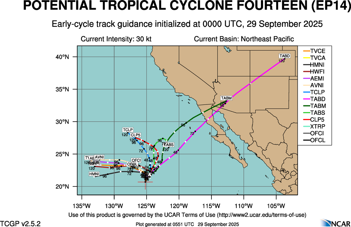 At 0600 UTC, 29 September 2025, FOURTEEN (EP14) was located in the Northeast Pacific basin at 21.2°N and 125.1°W. The current intensity was -999 kt and the center was moving at -999 kt at a bearing of -999 degrees. The minimum central pressure was -999 mb.