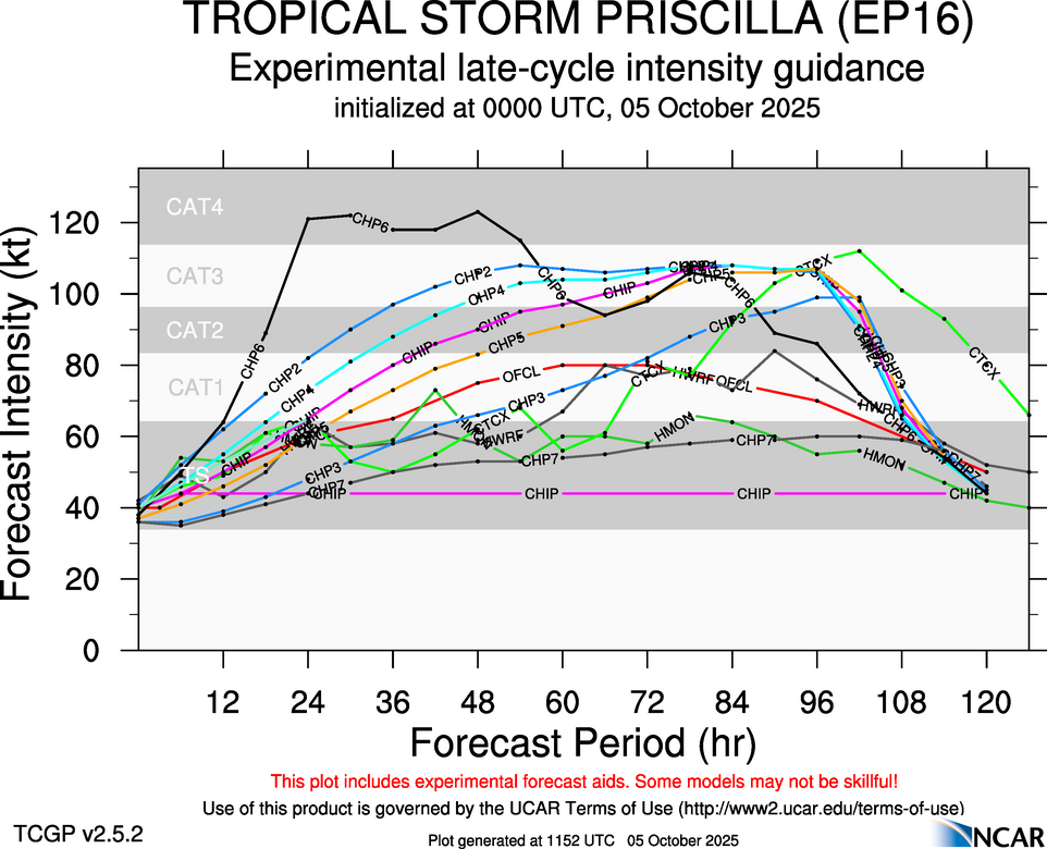This page provides plots and information for TROPICAL STORM PRISCILLA (EP16). The left side of this page provides TCGP-generated plots of numerical guidance and other TCGP-curated data. The right side of this page provides external links to additional information and products. Most of the model guidance displayed in the plots come from modeling centers outside of NCAR, such as NOAA, other national numerical weather prediction centers, and universities. Click here for information about who contributes to TCGP. Your use of this page is governed by the UCAR Terms of Service and this site's disclaimer. To obtain help for any item on this page, click on the question mark beside that item.