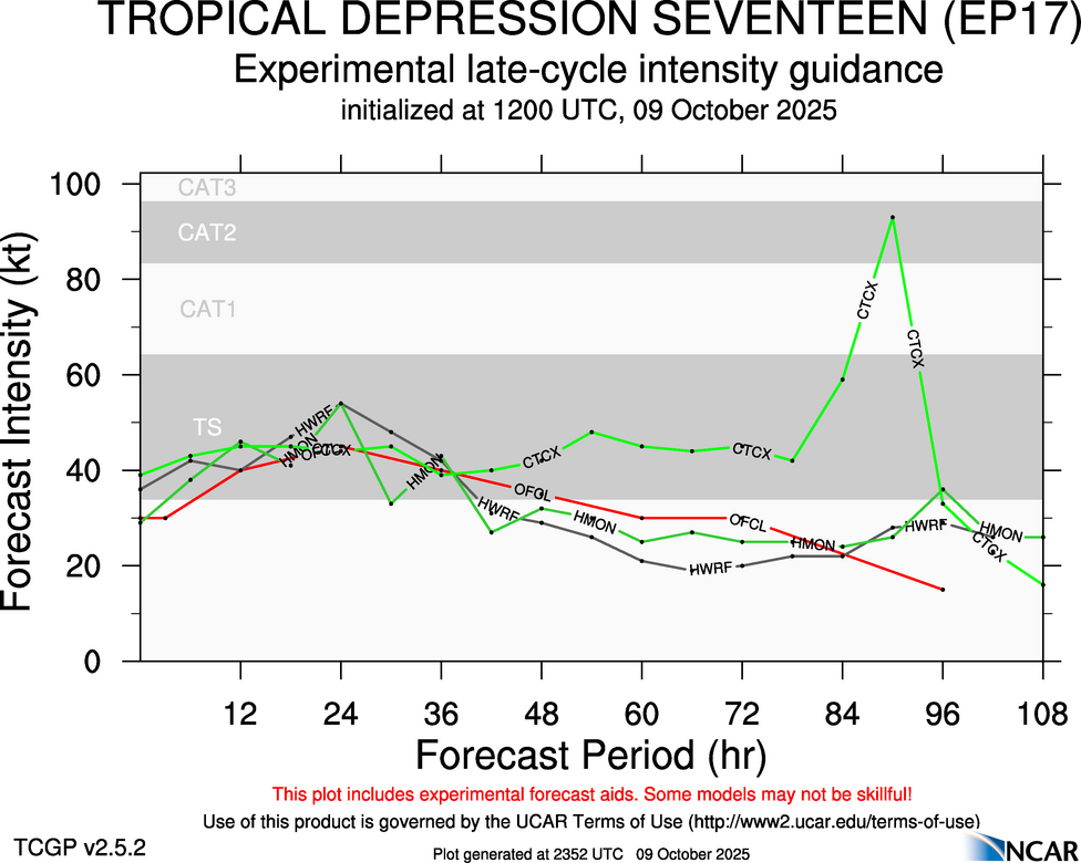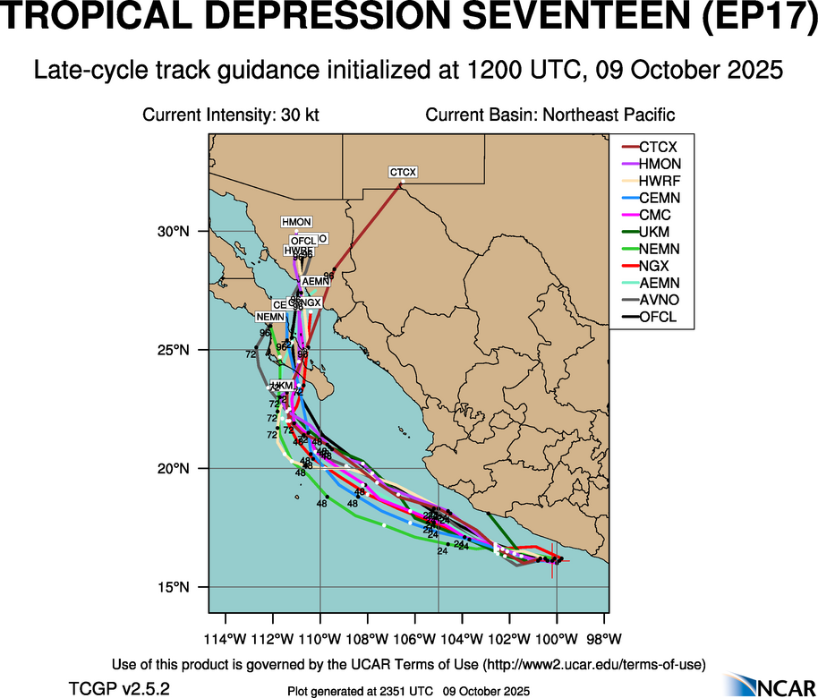 This page provides plots and information for TROPICAL STORM RAYMOND (EP17). The left side of this page provides TCGP-generated plots of numerical guidance and other TCGP-curated data. The right side of this page provides external links to additional information and products. Most of the model guidance displayed in the plots come from modeling centers outside of NCAR, such as NOAA, other national numerical weather prediction centers, and universities. Click here for information about who contributes to TCGP. Your use of this page is governed by the UCAR Terms of Service and this site's disclaimer. To obtain help for any item on this page, click on the question mark beside that item.