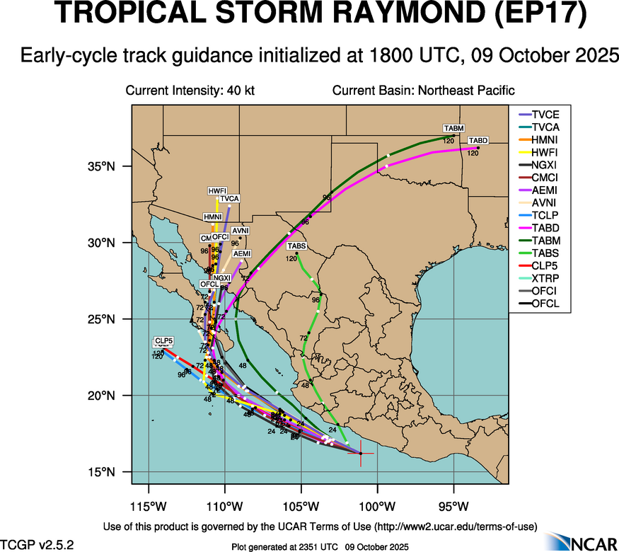 At 1800 UTC, 09 October 2025, TROPICAL STORM RAYMOND (EP17) was located in the Northeast Pacific basin at 16.2°N and 101.1°W. The current intensity was 40 kt and the center was moving at 12 kt at a bearing of 290 degrees. The minimum central pressure was 1002 mb.