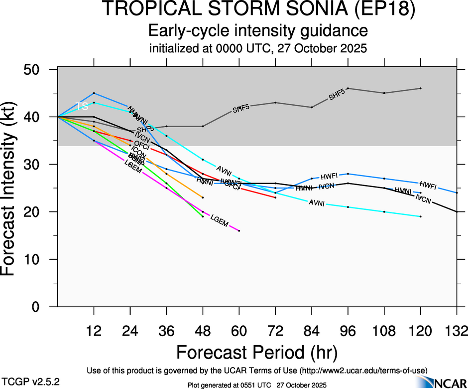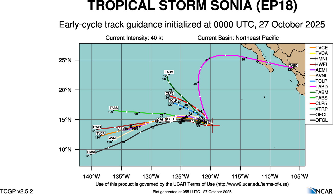 At 0000 UTC, 27 October 2025, TROPICAL STORM SONIA (EP18) was located in the Northeast Pacific basin at 14°N and 119.7°W. The current intensity was 40 kt and the center was moving at 2 kt at a bearing of 335 degrees. The minimum central pressure was 1004 mb.