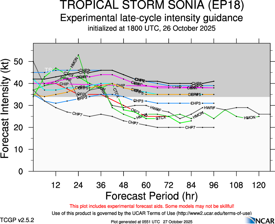 This page provides plots and information for TROPICAL STORM SONIA (EP18). The left side of this page provides TCGP-generated plots of numerical guidance and other TCGP-curated data. The right side of this page provides external links to additional information and products. Most of the model guidance displayed in the plots come from modeling centers outside of NCAR, such as NOAA, other national numerical weather prediction centers, and universities. Click here for information about who contributes to TCGP. Your use of this page is governed by the UCAR Terms of Service and this site's disclaimer. To obtain help for any item on this page, click on the question mark beside that item.