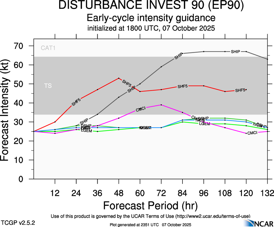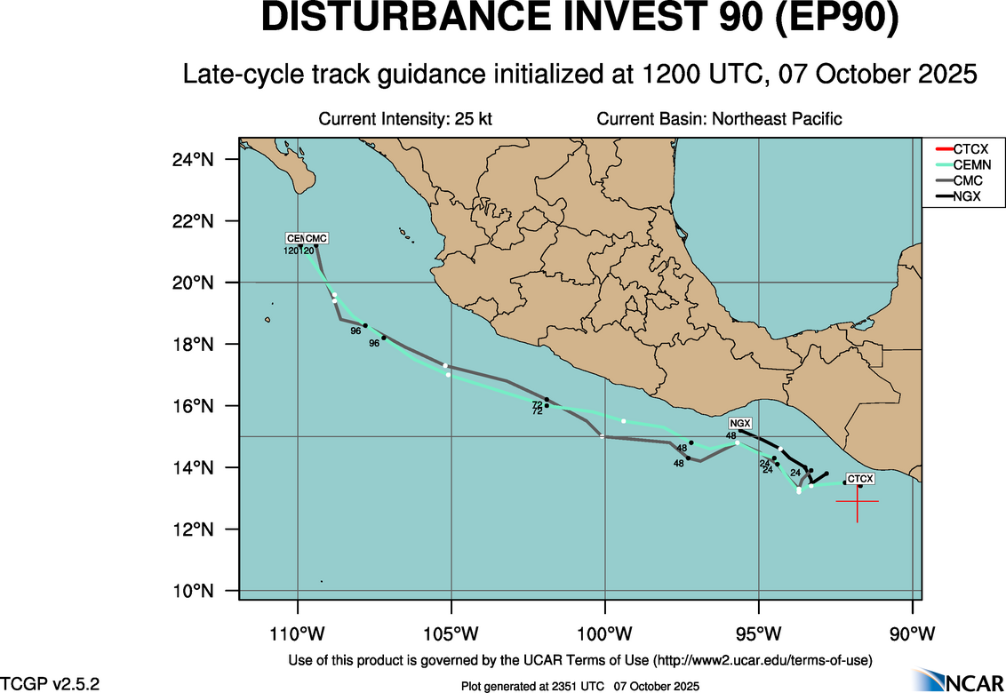 At 1800 UTC, 07 October 2025, DISTURBANCE INVEST 90 (EP90) was located in the Northeast Pacific basin at 14°N and 92.8°W. The current intensity was 25 kt and the center was moving at 12 kt at a bearing of 310 degrees. The minimum central pressure was 1007 mb.