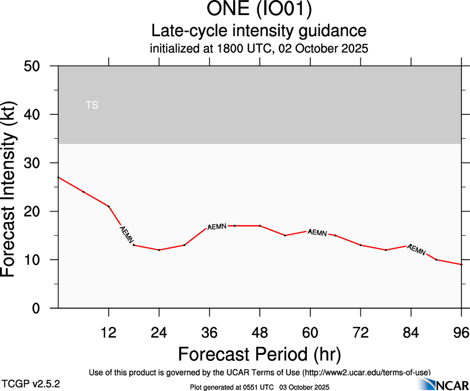 This page provides plots and information for ONE (IO01). The left side of this page provides TCGP-generated plots of numerical guidance and other TCGP-curated data. The right side of this page provides external links to additional information and products. Most of the model guidance displayed in the plots come from modeling centers outside of NCAR, such as NOAA, other national numerical weather prediction centers, and universities. Click here for information about who contributes to TCGP. Your use of this page is governed by the UCAR Terms of Service and this site's disclaimer. To obtain help for any item on this page, click on the question mark beside that item.