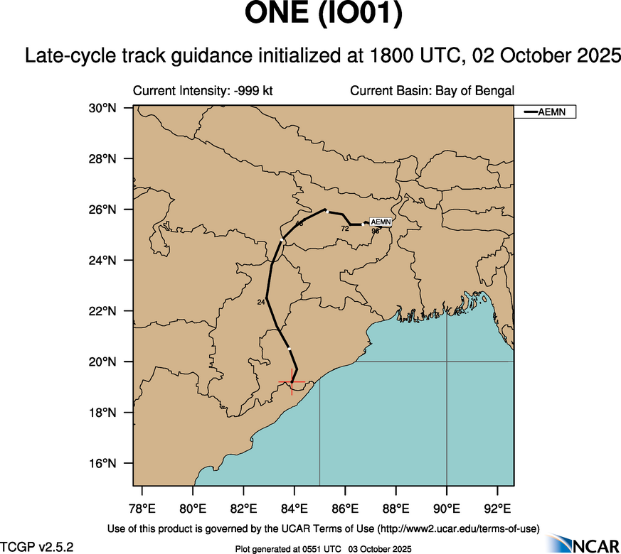 At 1800 UTC, 02 October 2025, ONE (IO01) was located in the Bay of Bengal basin at 19.2°N and 84°E. The current intensity was -999 kt and the center was moving at -999 kt at a bearing of -999 degrees. The minimum central pressure was -999 mb.