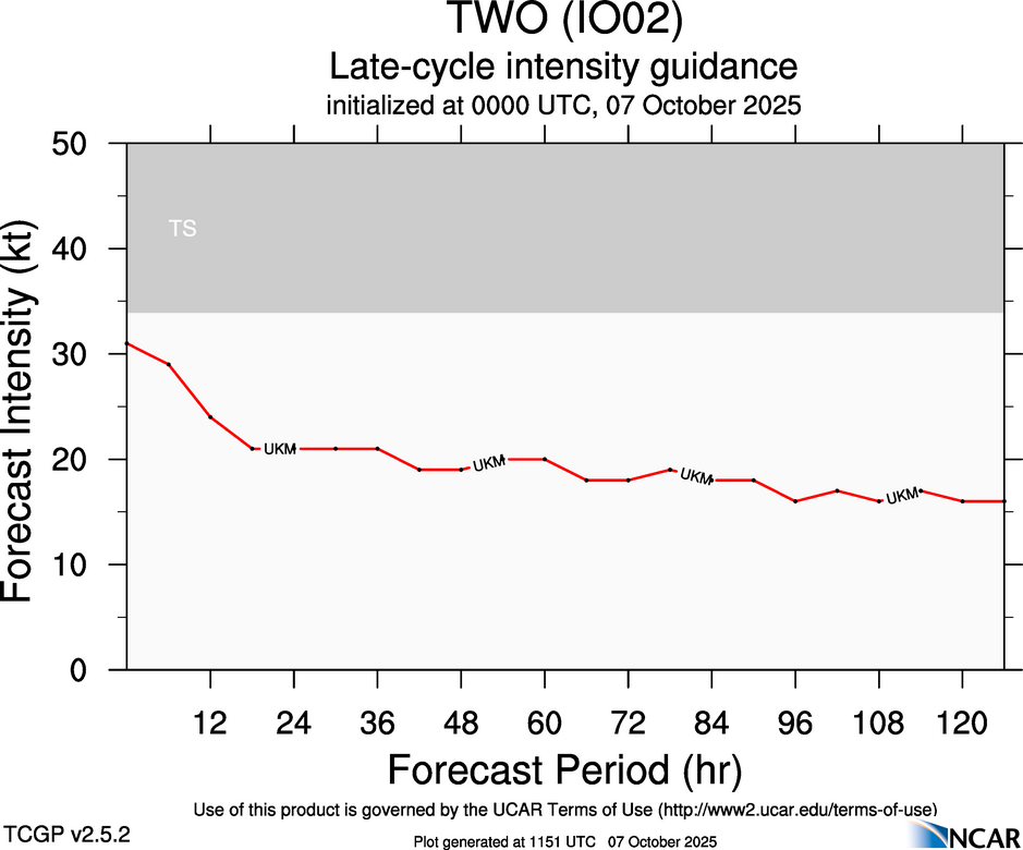 This page provides plots and information for TWO (IO02). The left side of this page provides TCGP-generated plots of numerical guidance and other TCGP-curated data. The right side of this page provides external links to additional information and products. Most of the model guidance displayed in the plots come from modeling centers outside of NCAR, such as NOAA, other national numerical weather prediction centers, and universities. Click here for information about who contributes to TCGP. Your use of this page is governed by the UCAR Terms of Service and this site's disclaimer. To obtain help for any item on this page, click on the question mark beside that item.