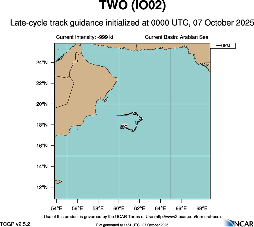 At 0000 UTC, 07 October 2025, TWO (IO02) was located in the Arabian Sea basin at 18.9°N and 60.3°E. The current intensity was -999 kt and the center was moving at -999 kt at a bearing of -999 degrees. The minimum central pressure was -999 mb.