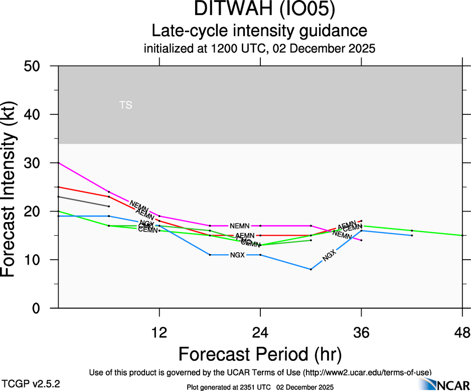 At 1800 UTC, 02 December 2025, FIVE (IO05) was located in the Bay of Bengal basin at 12.2°N and 80.2°E. The current intensity was -999 kt and the center was moving at -999 kt at a bearing of -999 degrees. The minimum central pressure was -999 mb.