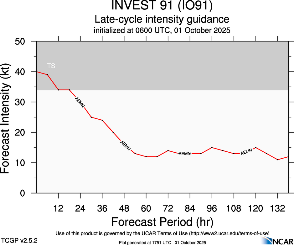 This page provides plots and information for INVEST 91 (IO91). The left side of this page provides TCGP-generated plots of numerical guidance and other TCGP-curated data. The right side of this page provides external links to additional information and products. Most of the model guidance displayed in the plots come from modeling centers outside of NCAR, such as NOAA, other national numerical weather prediction centers, and universities. Click here for information about who contributes to TCGP. Your use of this page is governed by the UCAR Terms of Service and this site's disclaimer. To obtain help for any item on this page, click on the question mark beside that item.