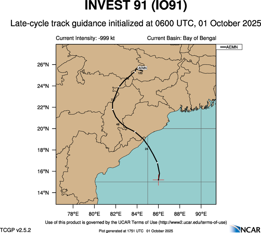At 0600 UTC, 01 October 2025, INVEST 91 (IO91) was located in the Bay of Bengal basin at 15°N and 85.1°E. The current intensity was -999 kt and the center was moving at -999 kt at a bearing of -999 degrees. The minimum central pressure was -999 mb.