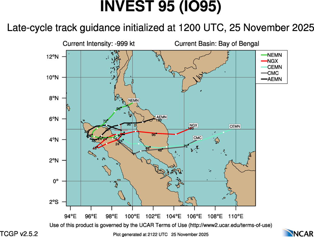At 1200 UTC, 25 November 2025, INVEST 95 (IO95) was located in the Bay of Bengal basin at 4.9°N and 98.9°E. The current intensity was -999 kt and the center was moving at -999 kt at a bearing of -999 degrees. The minimum central pressure was -999 mb.