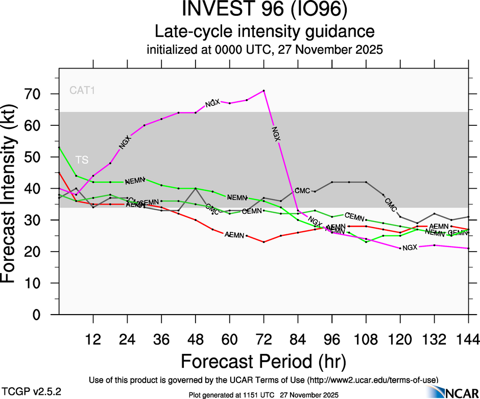 At 0000 UTC, 27 November 2025, INVEST 96 (IO96) was located in the Bay of Bengal basin at 5.9°N and 81.9°E. The current intensity was -999 kt and the center was moving at -999 kt at a bearing of -999 degrees. The minimum central pressure was -999 mb.