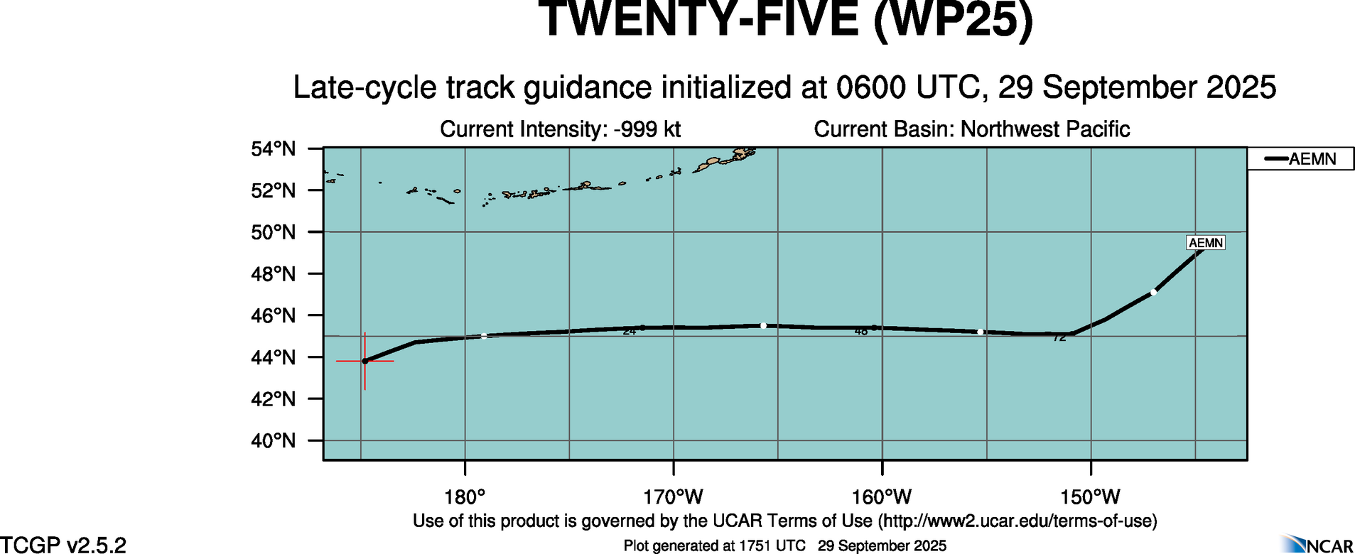 At 0600 UTC, 29 September 2025, TWENTY-FIVE (WP25) was located in the Northwest Pacific basin at 43.6°N and 174.9°E. The current intensity was -999 kt and the center was moving at -999 kt at a bearing of -999 degrees. The minimum central pressure was -999 mb.