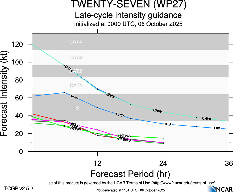 This page provides plots and information for TWENTY-SEVEN (WP27). The left side of this page provides TCGP-generated plots of numerical guidance and other TCGP-curated data. The right side of this page provides external links to additional information and products. Most of the model guidance displayed in the plots come from modeling centers outside of NCAR, such as NOAA, other national numerical weather prediction centers, and universities. Click here for information about who contributes to TCGP. Your use of this page is governed by the UCAR Terms of Service and this site's disclaimer. To obtain help for any item on this page, click on the question mark beside that item.