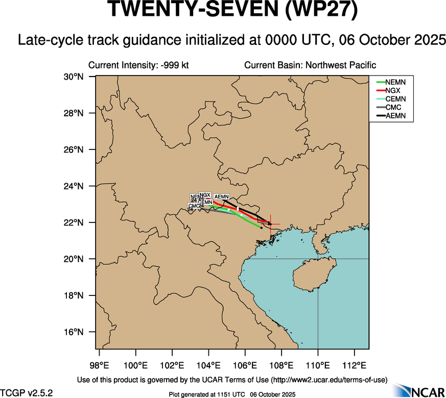 At 0000 UTC, 06 October 2025, TWENTY-SEVEN (WP27) was located in the Northwest Pacific basin at 22°N and 107°E. The current intensity was -999 kt and the center was moving at -999 kt at a bearing of -999 degrees. The minimum central pressure was -999 mb.