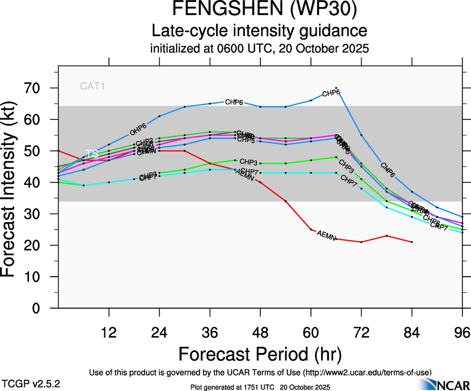 At 1200 UTC, 20 October 2025, FENGSHEN (WP30) was located in the Northwest Pacific basin at 18.5°N and 114.2°E. The current intensity was 45 kt and the center was moving at 12 kt at a bearing of 295 degrees. The minimum central pressure was 994 mb.