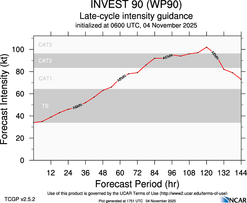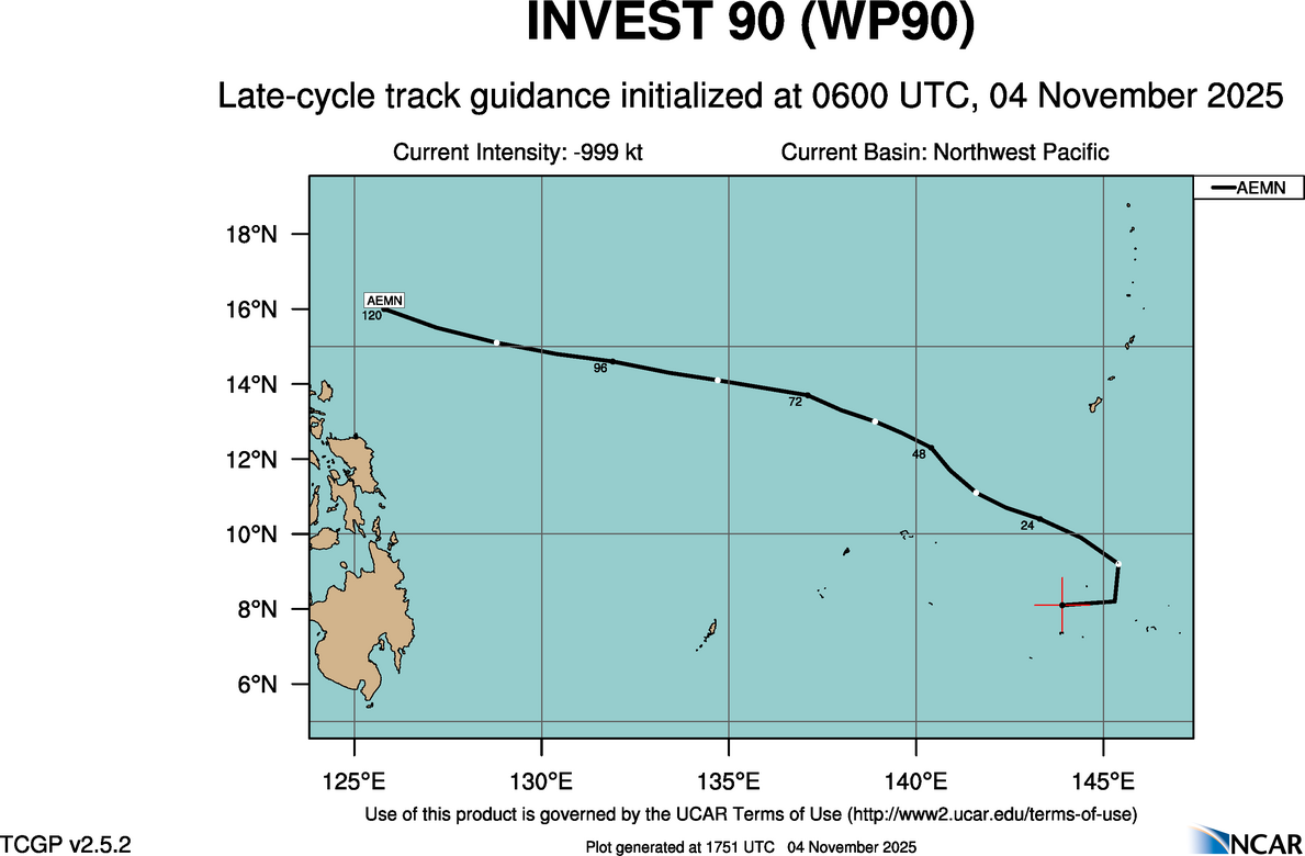 This page provides plots and information for INVEST 90 (WP90). The left side of this page provides TCGP-generated plots of numerical guidance and other TCGP-curated data. The right side of this page provides external links to additional information and products. Most of the model guidance displayed in the plots come from modeling centers outside of NCAR, such as NOAA, other national numerical weather prediction centers, and universities. Click here for information about who contributes to TCGP. Your use of this page is governed by the UCAR Terms of Service and this site's disclaimer. To obtain help for any item on this page, click on the question mark beside that item.