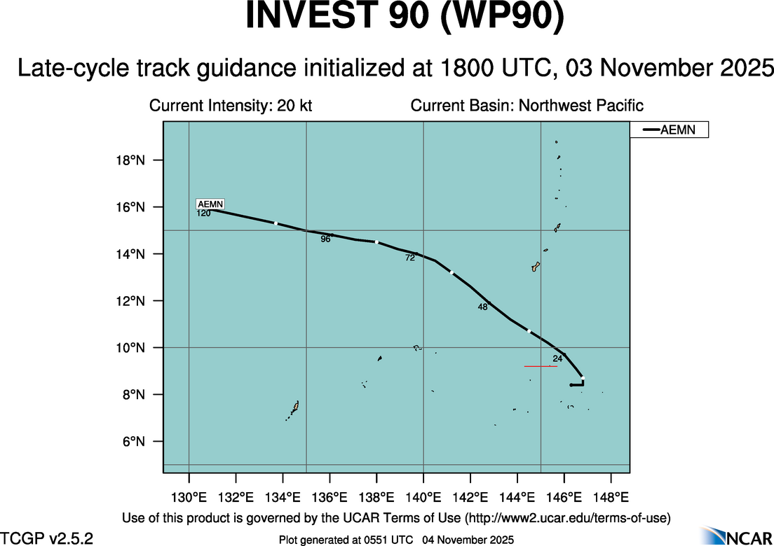 At 1800 UTC, 03 November 2025, INVEST 90 (WP90) was located in the Northwest Pacific basin at 9.2°N and 145°E. The current intensity was 20 kt and the center was moving at 7 kt at a bearing of 290 degrees. The minimum central pressure was 1004 mb.