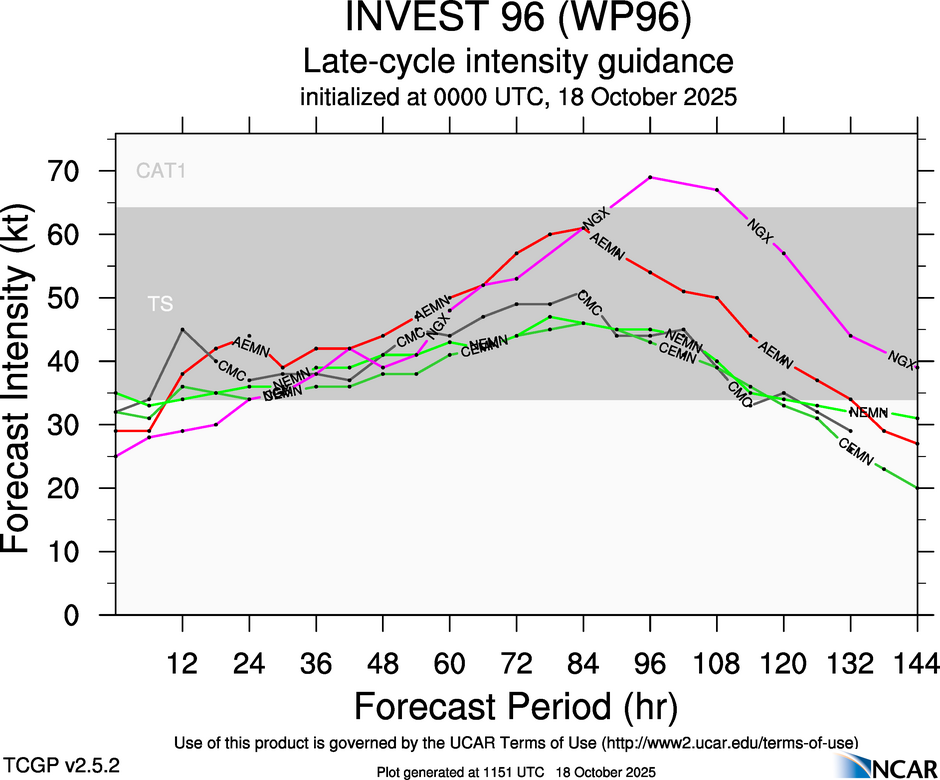 This page provides plots and information for INVEST 96 (WP96). The left side of this page provides TCGP-generated plots of numerical guidance and other TCGP-curated data. The right side of this page provides external links to additional information and products. Most of the model guidance displayed in the plots come from modeling centers outside of NCAR, such as NOAA, other national numerical weather prediction centers, and universities. Click here for information about who contributes to TCGP. Your use of this page is governed by the UCAR Terms of Service and this site's disclaimer. To obtain help for any item on this page, click on the question mark beside that item.