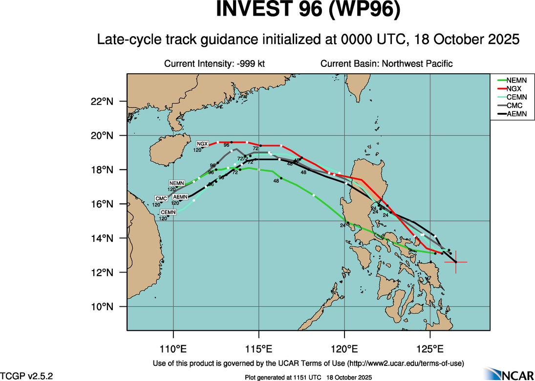 At 0000 UTC, 18 October 2025, INVEST 96 (WP96) was located in the Northwest Pacific basin at 13.3°N and 126.6°E. The current intensity was -999 kt and the center was moving at -999 kt at a bearing of -999 degrees. The minimum central pressure was -999 mb.