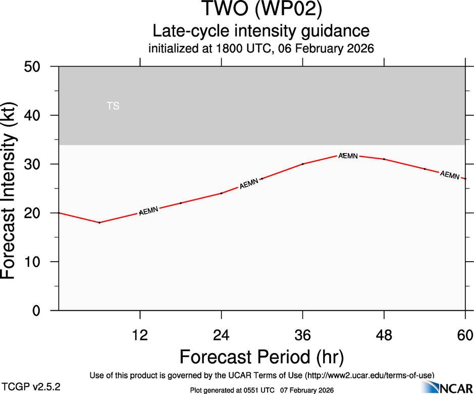 This page provides plots and information for TWO (WP02). The left side of this page provides TCGP-generated plots of numerical guidance and other TCGP-curated data. The right side of this page provides external links to additional information and products. Most of the model guidance displayed in the plots come from modeling centers outside of NCAR, such as NOAA, other national numerical weather prediction centers, and universities. Click here for information about who contributes to TCGP. Your use of this page is governed by the UCAR Terms of Service and this site's disclaimer. To obtain help for any item on this page, click on the question mark beside that item.