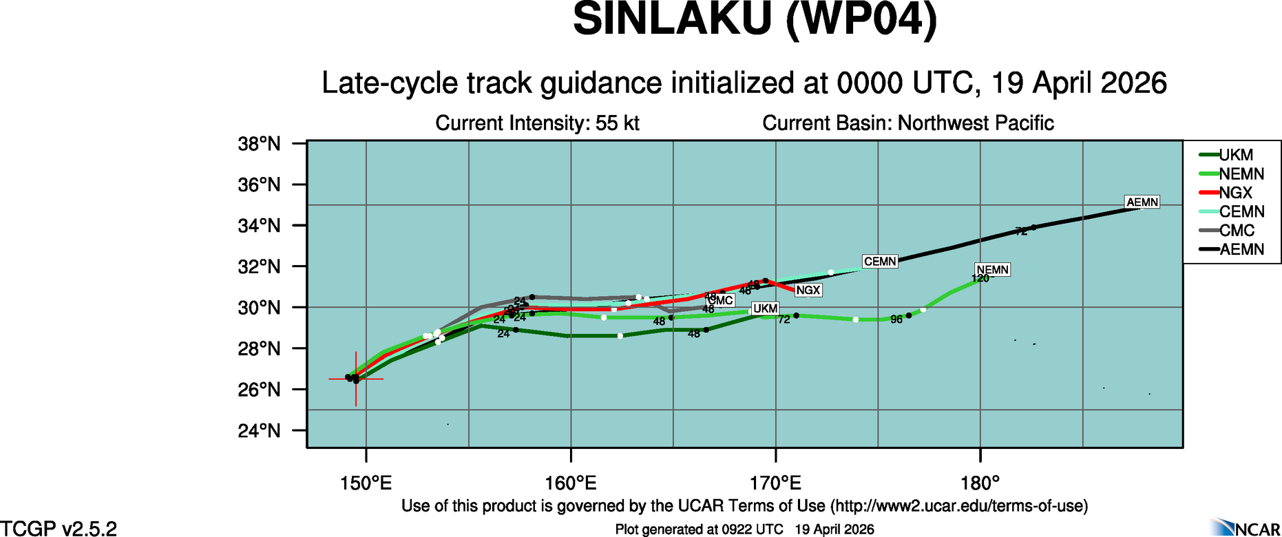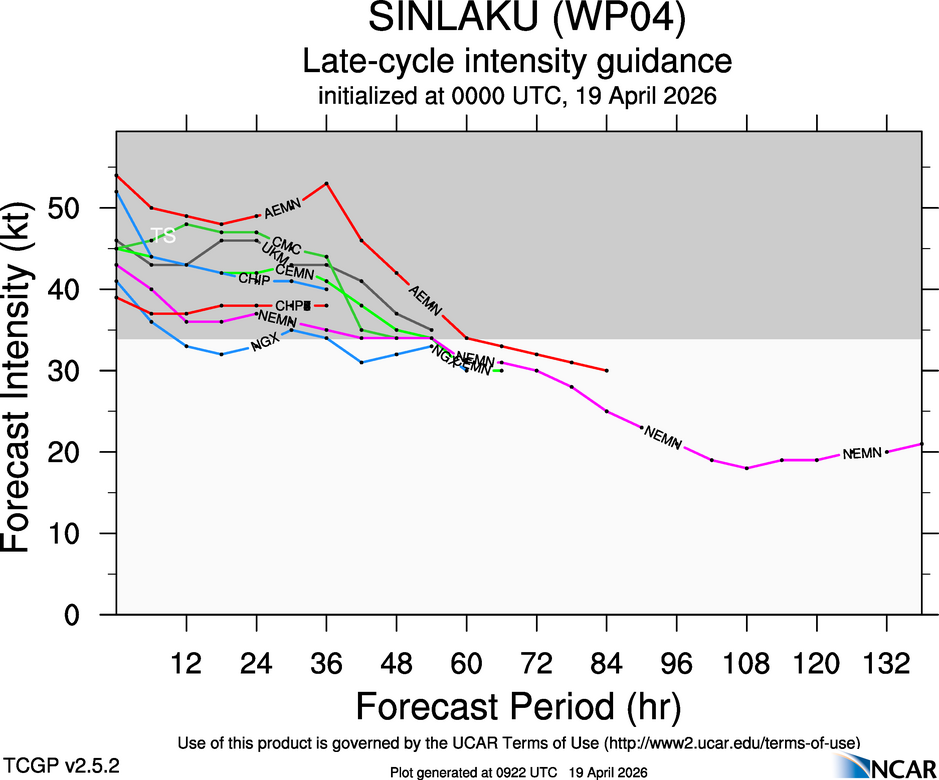 This page provides plots and information for SINLAKU (WP04). The left side of this page provides TCGP-generated plots of numerical guidance and other TCGP-curated data. The right side of this page provides external links to additional information and products. Most of the model guidance displayed in the plots come from modeling centers outside of NCAR, such as NOAA, other national numerical weather prediction centers, and universities. Click here for information about who contributes to TCGP. Your use of this page is governed by the UCAR Terms of Service and this site's disclaimer. To obtain help for any item on this page, click on the question mark beside that item.