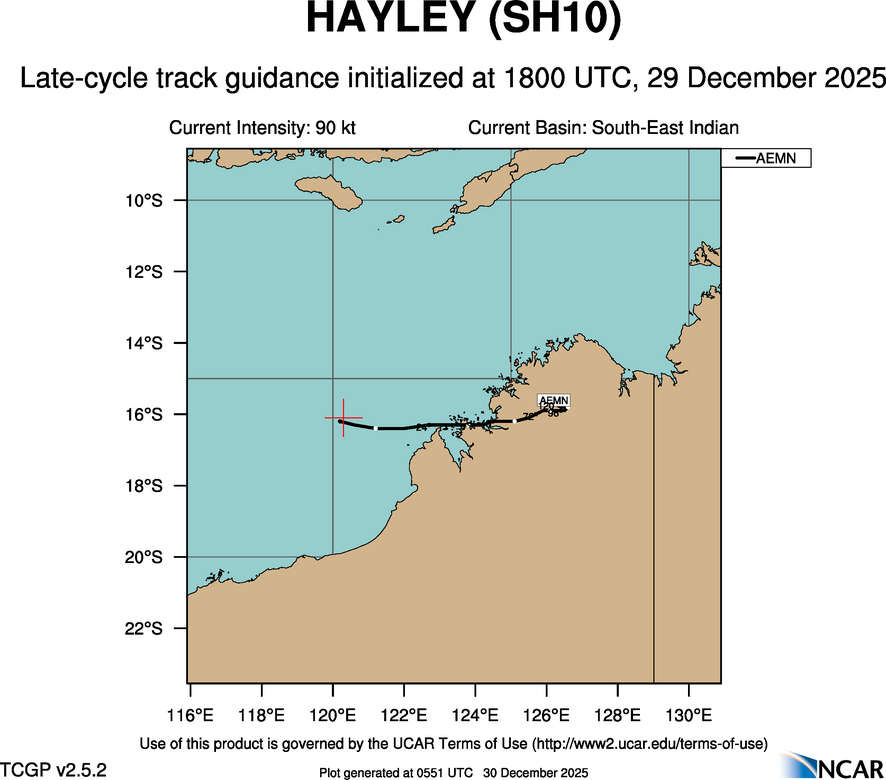 At 0000 UTC, 30 December 2025, HAYLEY (SH10) was located in the South-East Indian basin at 16.4°S and 121.2°E. The current intensity was 90 kt and the center was moving at 7 kt at a bearing of 125 degrees. The minimum central pressure was 966 mb.