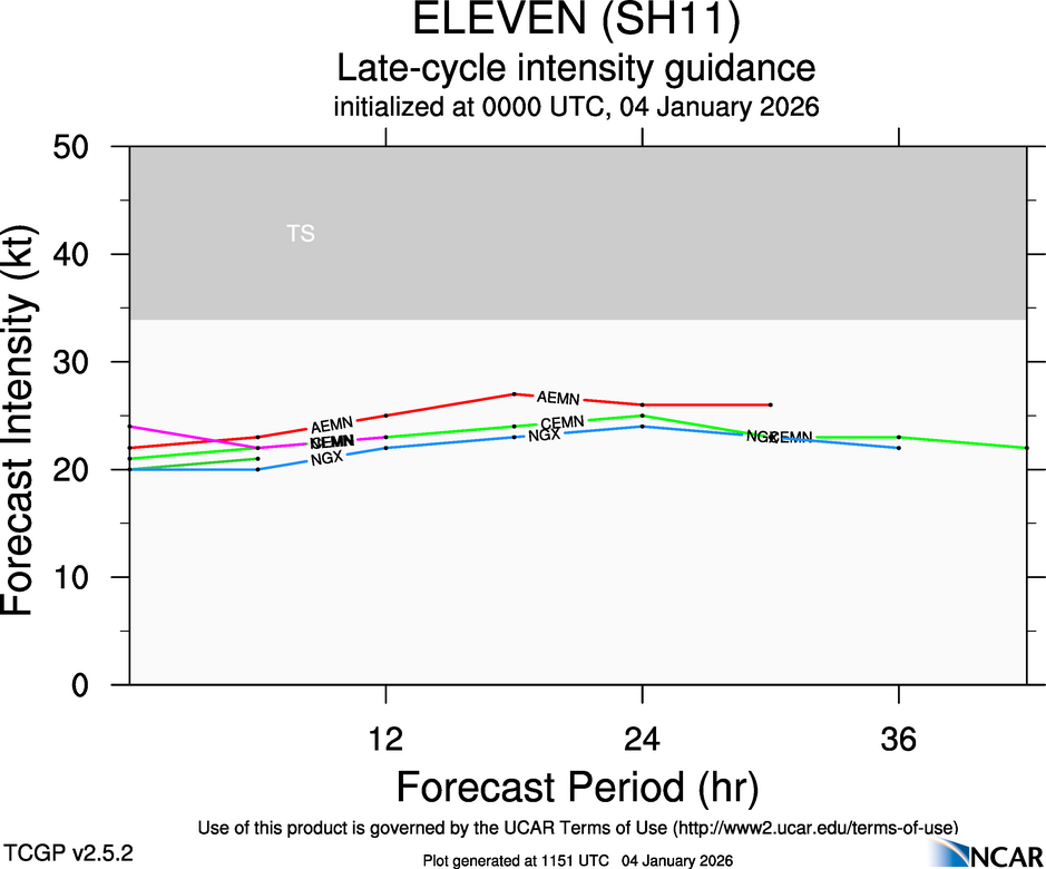 This page provides plots and information for ELEVEN (SH11). The left side of this page provides TCGP-generated plots of numerical guidance and other TCGP-curated data. The right side of this page provides external links to additional information and products. Most of the model guidance displayed in the plots come from modeling centers outside of NCAR, such as NOAA, other national numerical weather prediction centers, and universities. Click here for information about who contributes to TCGP. Your use of this page is governed by the UCAR Terms of Service and this site's disclaimer. To obtain help for any item on this page, click on the question mark beside that item.