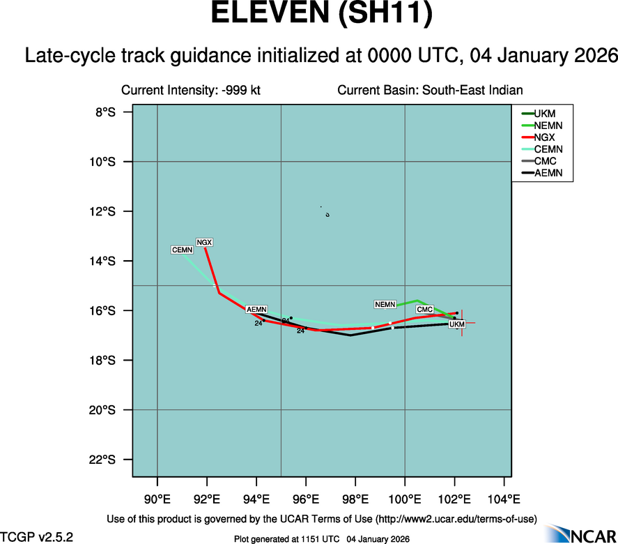 At 0000 UTC, 04 January 2026, ELEVEN (SH11) was located in the South-East Indian basin at 16.4°S and 102.2°E. The current intensity was -999 kt and the center was moving at -999 kt at a bearing of -999 degrees. The minimum central pressure was -999 mb.