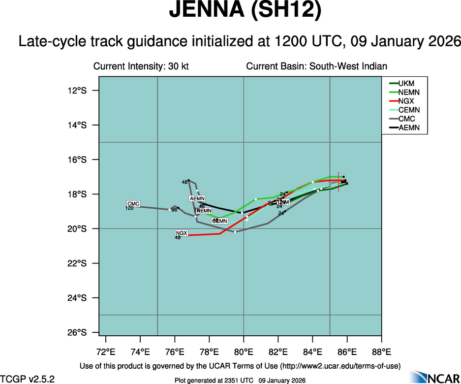 At 1800 UTC, 09 January 2026, TWELVE (SH12) was located in the South-West Indian basin at 17.4°S and 85.3°E. The current intensity was -999 kt and the center was moving at -999 kt at a bearing of -999 degrees. The minimum central pressure was -999 mb.