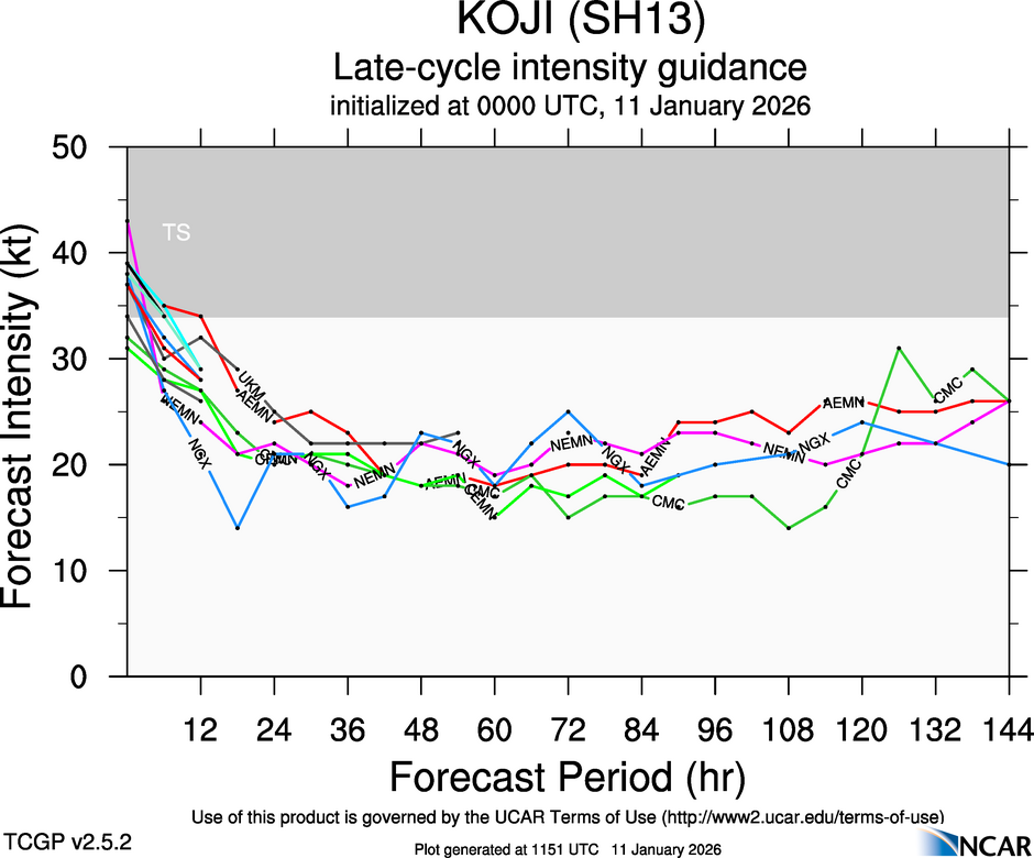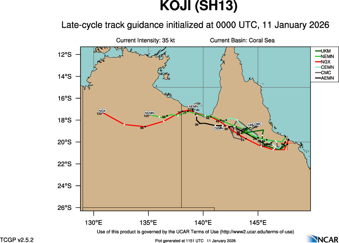 At 0600 UTC, 11 January 2026, KOJI (SH13) was located in the Coral Sea basin at 20.7°S and 147.3°E. The current intensity was 30 kt and the center was moving at 9 kt at a bearing of 195 degrees. The minimum central pressure was 993 mb.