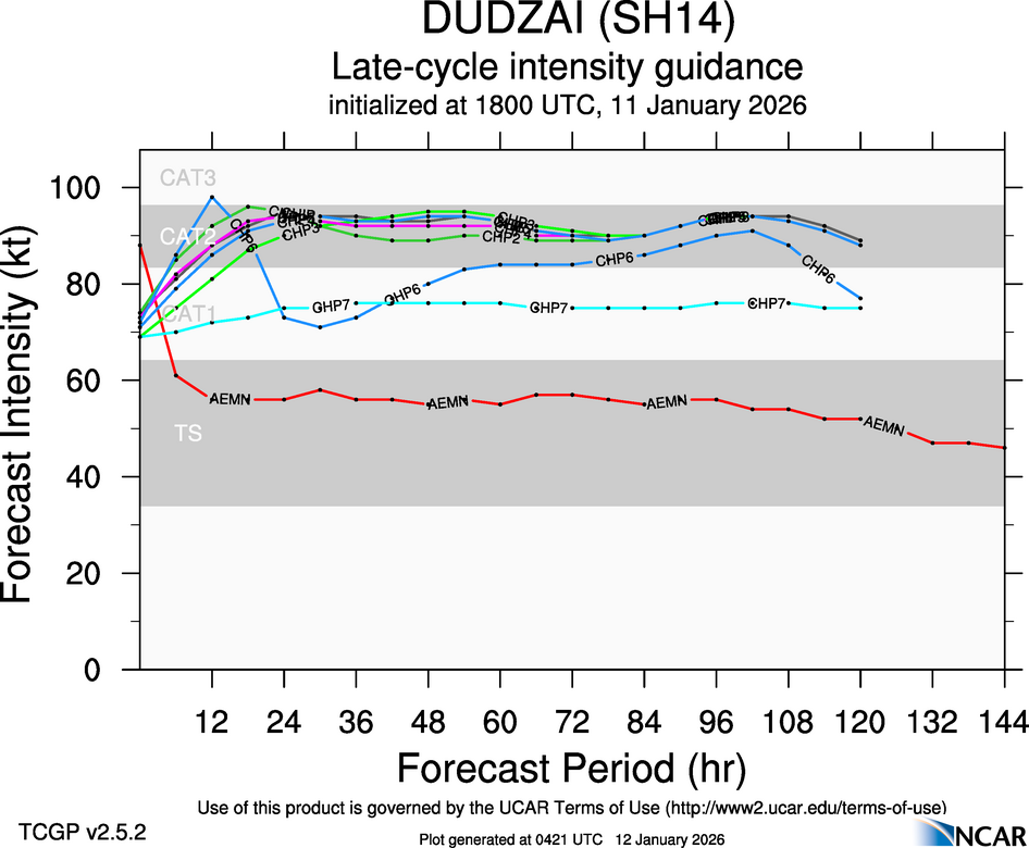 At 0000 UTC, 12 January 2026, DUDZAI (SH14) was located in the South-West Indian basin at 16.3°S and 77.8°E. The current intensity was 85 kt and the center was moving at 6 kt at a bearing of 140 degrees. The minimum central pressure was 974 mb.