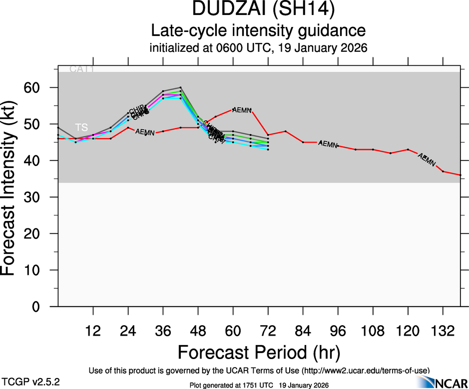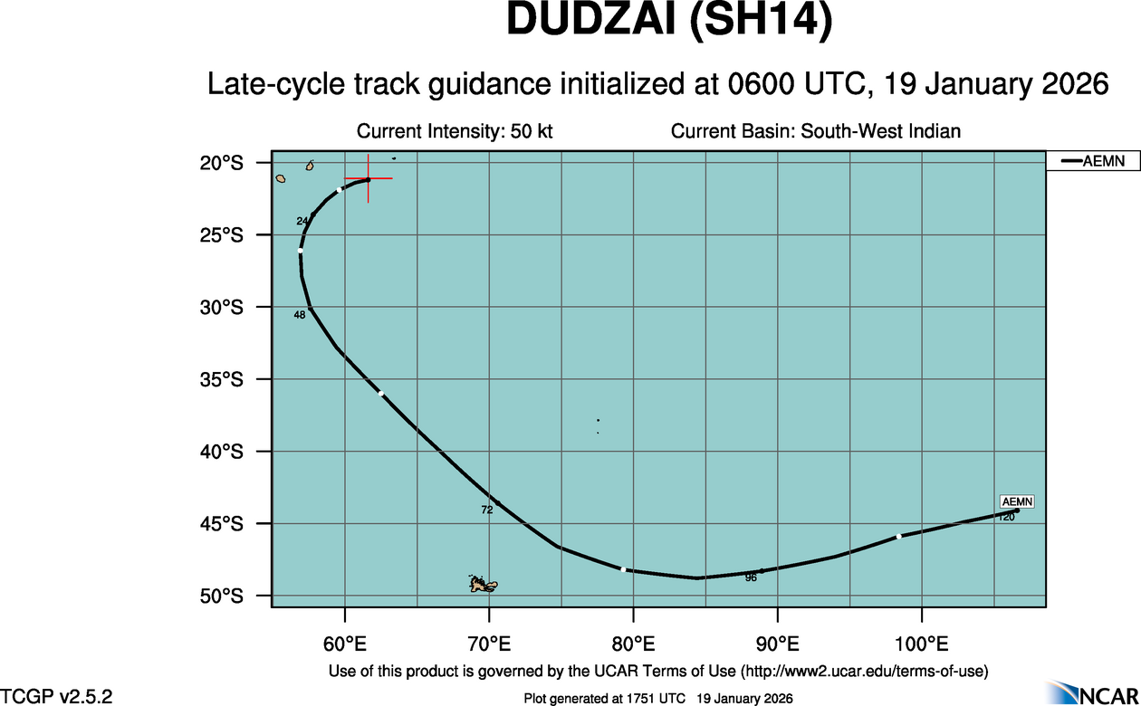 At 1200 UTC, 19 January 2026, DUDZAI (SH14) was located in the South-West Indian basin at 21.7°S and 60.7°E. The current intensity was 50 kt and the center was moving at 11 kt at a bearing of 255 degrees. The minimum central pressure was 995 mb.