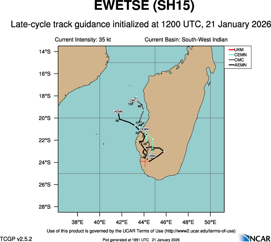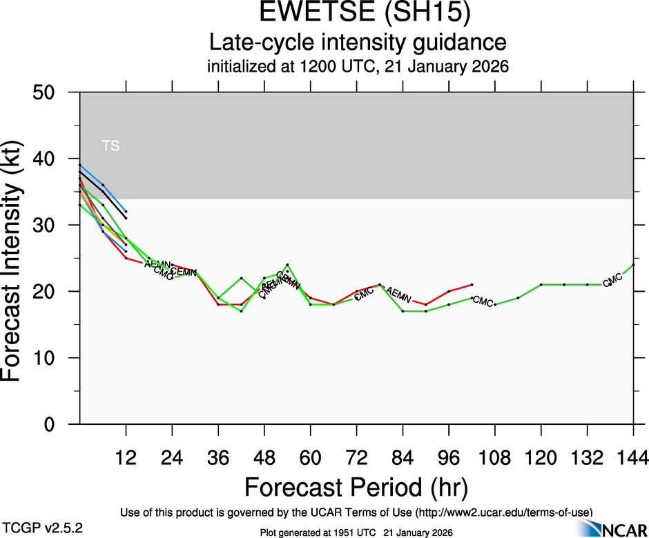 At 1200 UTC, 21 January 2026, EWETSE (SH15) was located in the South-West Indian basin at 23.9°S and 44.1°E. The current intensity was 35 kt and the center was moving at 9 kt at a bearing of 70 degrees. The minimum central pressure was 999 mb.