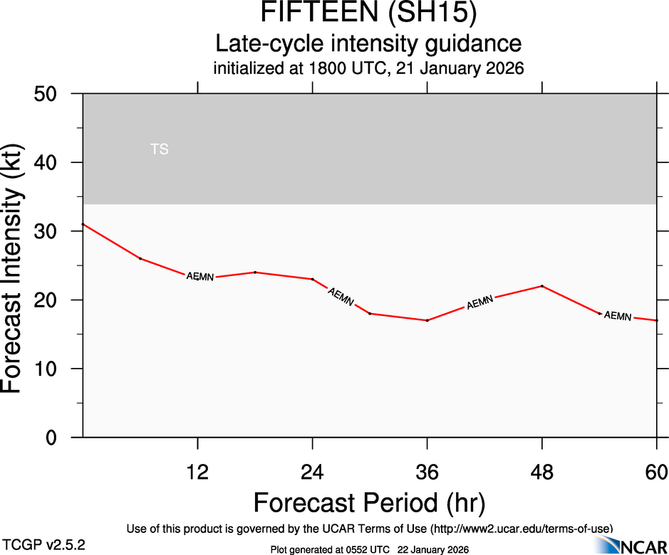 This page provides plots and information for FIFTEEN (SH15). The left side of this page provides TCGP-generated plots of numerical guidance and other TCGP-curated data. The right side of this page provides external links to additional information and products. Most of the model guidance displayed in the plots come from modeling centers outside of NCAR, such as NOAA, other national numerical weather prediction centers, and universities. Click here for information about who contributes to TCGP. Your use of this page is governed by the UCAR Terms of Service and this site's disclaimer. To obtain help for any item on this page, click on the question mark beside that item.