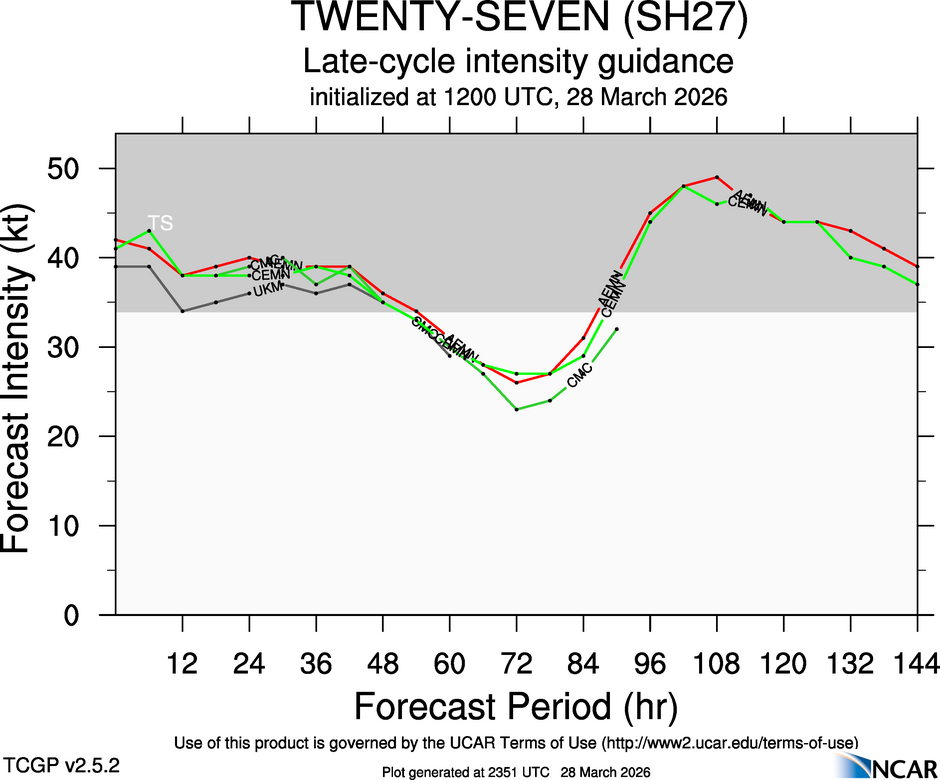 This page provides plots and information for TWENTY-SEVEN (SH27). The left side of this page provides TCGP-generated plots of numerical guidance and other TCGP-curated data. The right side of this page provides external links to additional information and products. Most of the model guidance displayed in the plots come from modeling centers outside of NCAR, such as NOAA, other national numerical weather prediction centers, and universities. Click here for information about who contributes to TCGP. Your use of this page is governed by the UCAR Terms of Service and this site's disclaimer. To obtain help for any item on this page, click on the question mark beside that item.