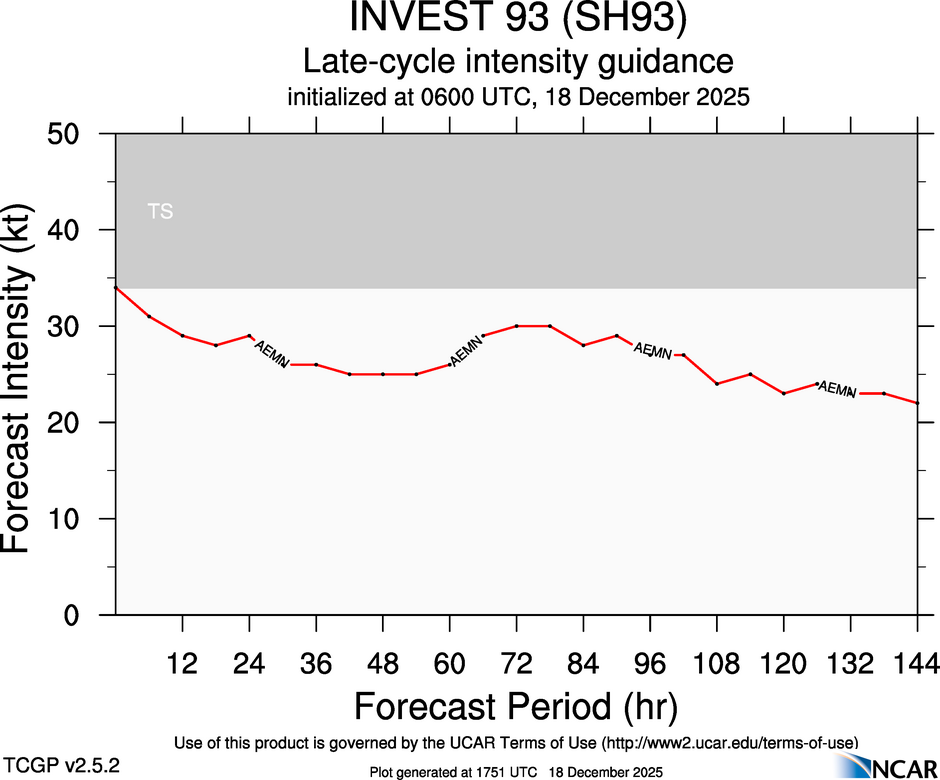 At 0600 UTC, 18 December 2025, INVEST 93 (SH93) was located in the South-East Indian basin at 12.7°S and 110°E. The current intensity was -999 kt and the center was moving at -999 kt at a bearing of -999 degrees. The minimum central pressure was -999 mb.