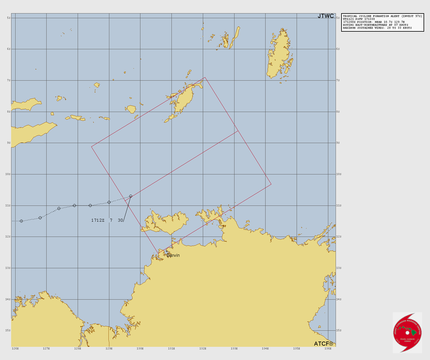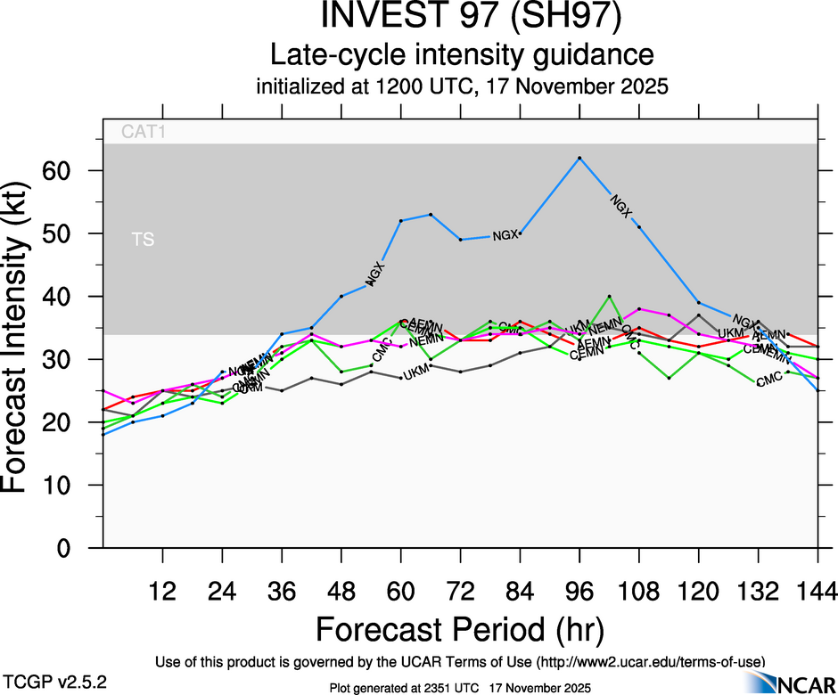 At 1800 UTC, 17 November 2025, INVEST 97 (SH97) was located in the South-East Indian basin at 10.6°S and 130°E. The current intensity was 30 kt and the center was moving at 5 kt at a bearing of 75 degrees. The minimum central pressure was 1002 mb.